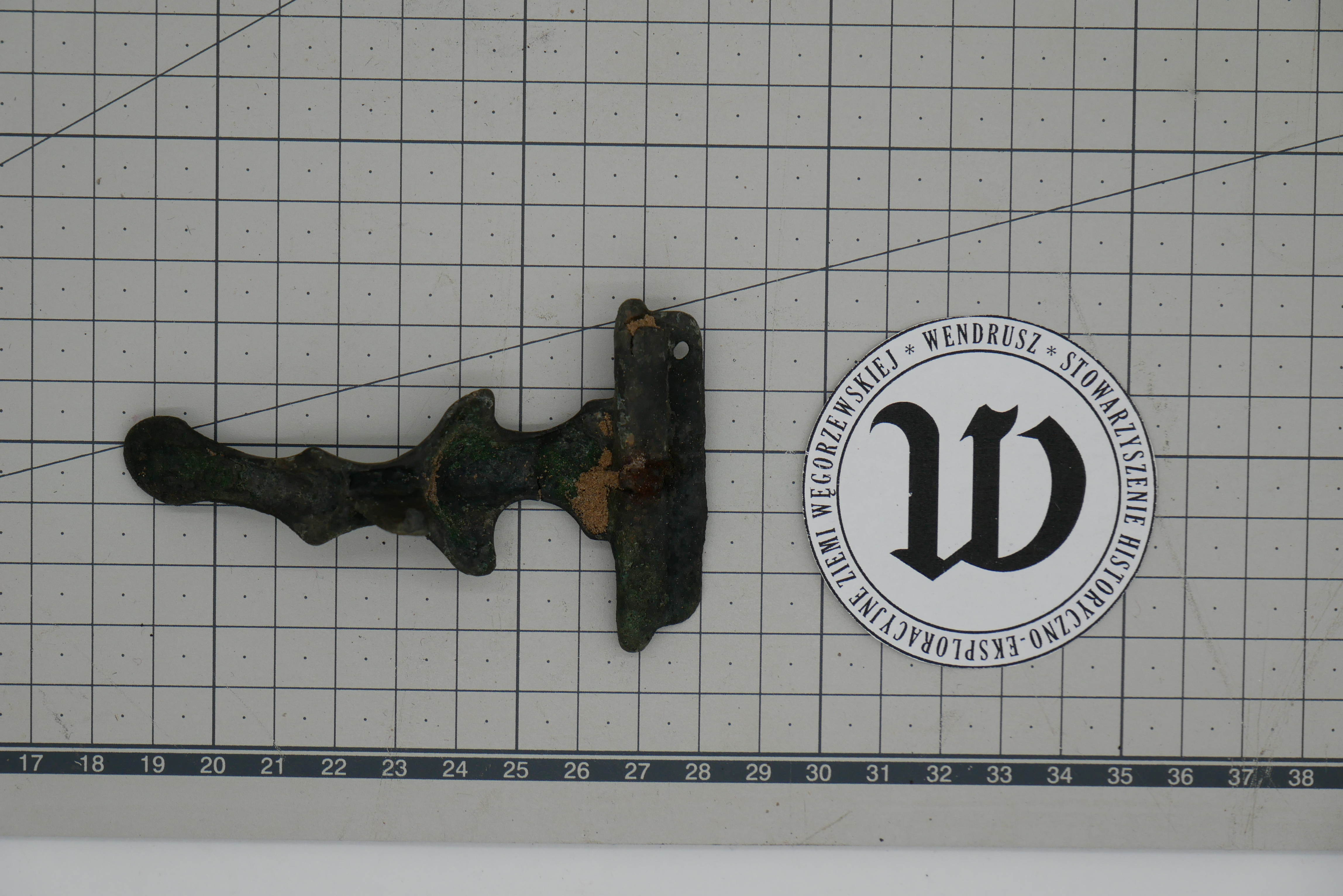 Zapinka trójgrzebykowa typu mazurskiego, lokalnej wariacji charakterystycznej dla Bałtów, jedna z czterech fibul znalezionego skarbu archeologicznego WENDRUSZa poszukiwania wendrusz mazury fibula zapinka