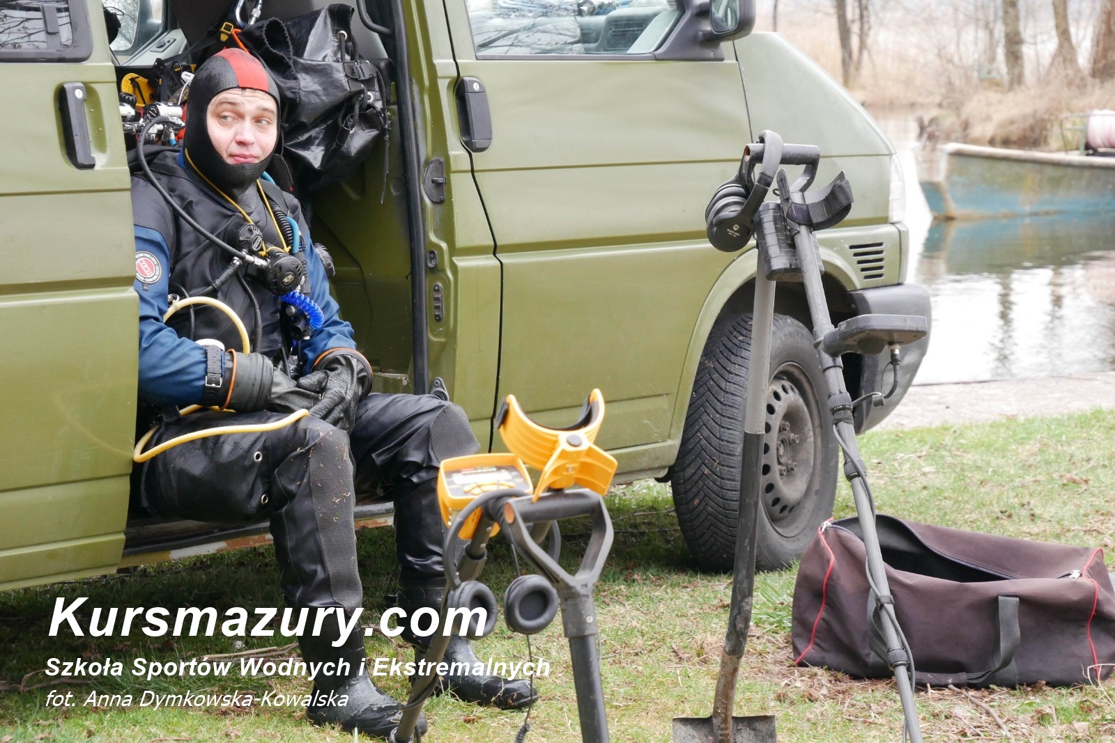 nurek w skafandrze wykrywacze metalu i łopaty Kal junkers 188 mamry węgorzewo rybaczówka wrak samolotu ju 188 pod wodą zatonął wyciąganie nurkowie historia mazury wielkie jeziora mazurskie na dnie jeziora grudzień 1944 r załoga akcja Wendrusz stowarzyszenie muzeum makieta modele łuski w wodzie elementy samolotu znalezione tajemnice mazur nad jeziorem spotkanie kwiecień kursmazury QRS MAZURY rejsy szkoleniowe trasa czartery jachtów