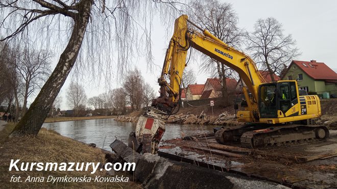 remont kanału giżyckiego łuczańskiego Giżycko mazury wielkie jeziora mazurskie sezon 2023 lato wakacje prace zamknięty most kolejowy w Giżycku śluza guzianka I Ruciane Nida śluza Karwik Pisz Węgorapa Węgorzewo woda nabrzeża larseny murki kursmazury qrs mazury czartery jachtów droga wodna trasa rejsu murki oporowe platforma koparka nad kanałem marzec rejsy żeglarskie przez całe mazury kurs żeglarski szkoleniowy obozy żeglarskie dla dorosłych zaplanuj rejs